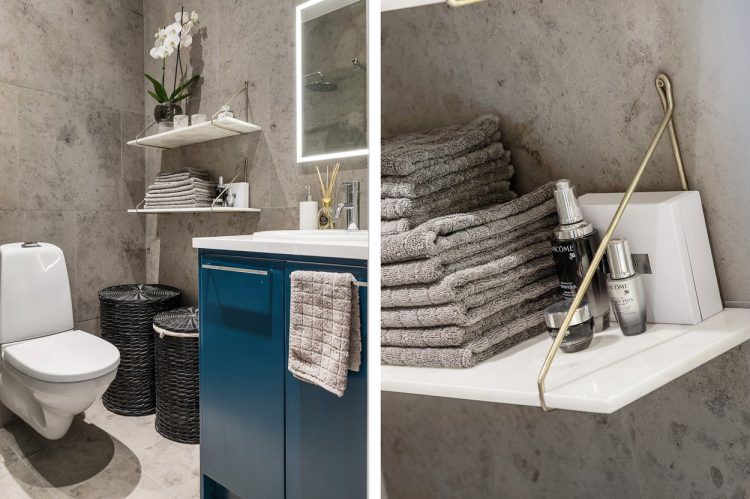 Phòng vệ sinh có diện tích khiêm tốn, được thiết kế khéo léo với tủ kệ và giá treo thuận tiện.